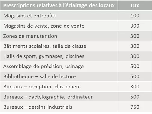 Dans le document suivant (source ecodis), vous constaterez que les intensités lumineuses sont très variées d’un type de local à un autre :